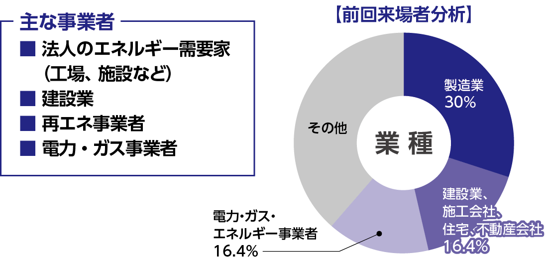 本展には再生可能エネルギーの導入やビジネスの協業を検討中の事業者、団体が来場し、出会いたい人に的確にアプローチができます。